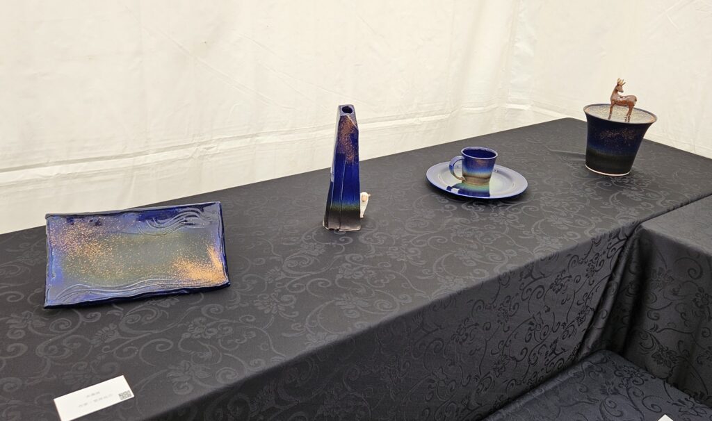 青い釉薬の作品を中心にオブジェや壺などを出品しました。