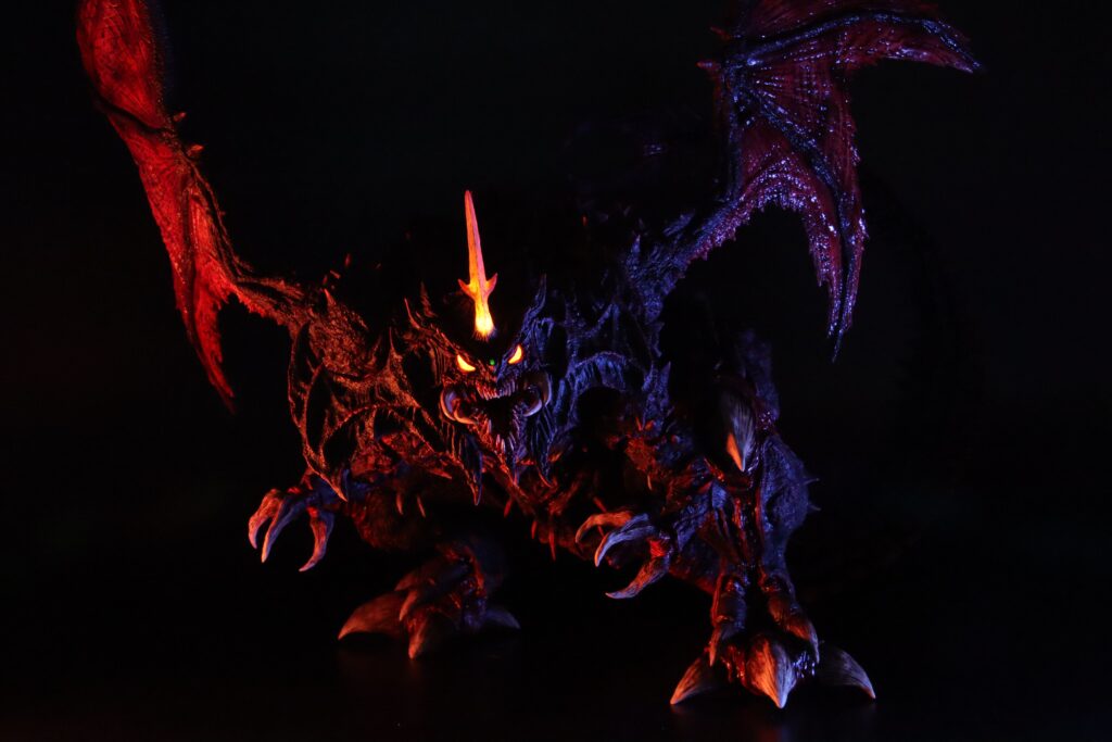 仕込んだライトユニット目やツノが光ることでデストロイアの凶悪さが暗闇で際立ち、さながら魔王のようになるのが大変気に入っています。